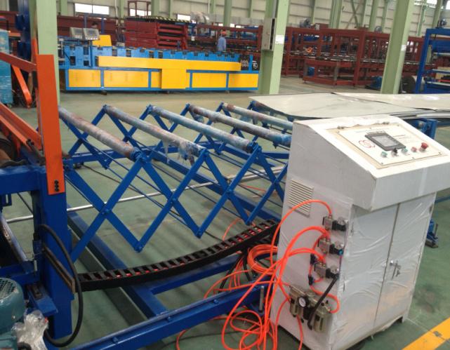 主要由瓦楞板壓型機和彩鋼復(fù)合機組成,可以一次性制做墻面彩鋼夾芯板或屋面彩鋼夾芯板,并且瓦楞板壓型機和復(fù)合機可以獨立生產(chǎn)。整條流水線壓型部分由彩鋼板開卷機、冷彎成型主機、切斷裝置組成,復(fù)合機部分由彩鋼板開卷,EPS板或巖棉板輸送,墻面淺波峰壓制,混合涂膠、加溫加壓、復(fù)合、平板卷邊、企口板翻邊、開槽、整邊、氣動夾緊、自動覆膜、自動切割、成品拖架組成;
